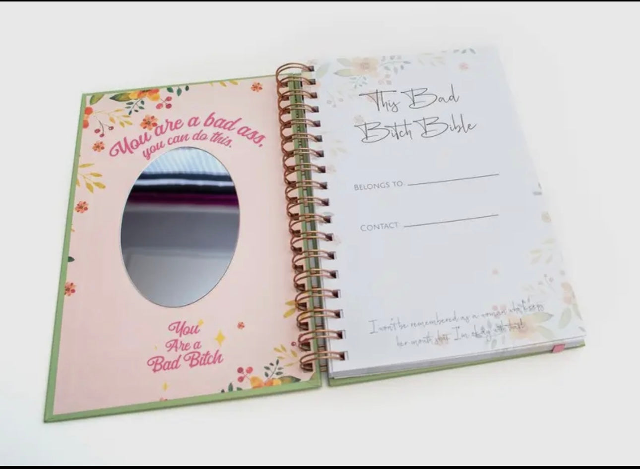 keep track of your bevvy intake,shopping spends and mood as well as making to-do lists,daily schedules,meal and fitness planners, and space for your important notes with 192 coloured pages full of handy sections. With badass stickers and glam mirror to apply your lippy, you can show the world what a stronger, empowering woman you really are! This spiral-bound journal has intricate rose gold foil detail on the cover as well as a band to keep it closed.